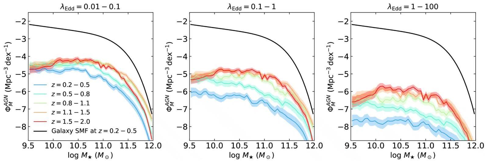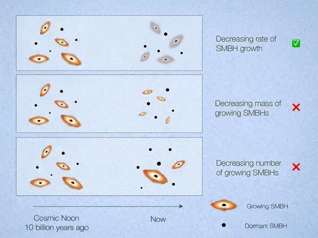 换句话说,黑洞本人莫得褪色,它们的数目也莫得显耀变化。它们仅仅在进食。正本在六合正午时期,黑洞不错以接近爱丁顿极限(黑洞简略承受的最大吸积速率)的速率进食。当今,它们的吸积速率下落到了阿谁数值的1/22驾驭。就像一个也曾在自助餐厅狼吞虎咽的东谈主,如今放慢了节律,因为食品变少了。