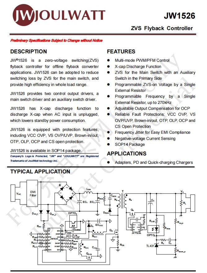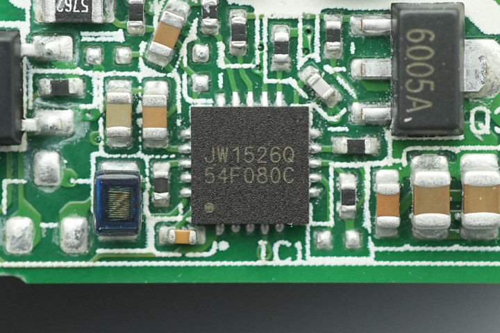 电源主控芯片承袭杰华特JW1526,这是一颗高频ZVS戒指器,ZVS怒放电压可编程,责任频率可编程,最高可达270KHz。此外内置负压电流采样,撑握X-cap放电以及加入抖频功能,改善系统的EMI性能,撑握30-200W快充诓骗。