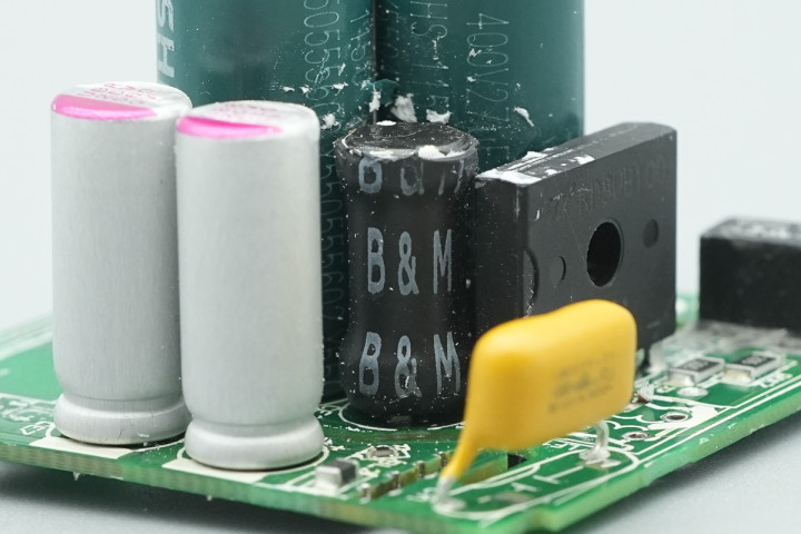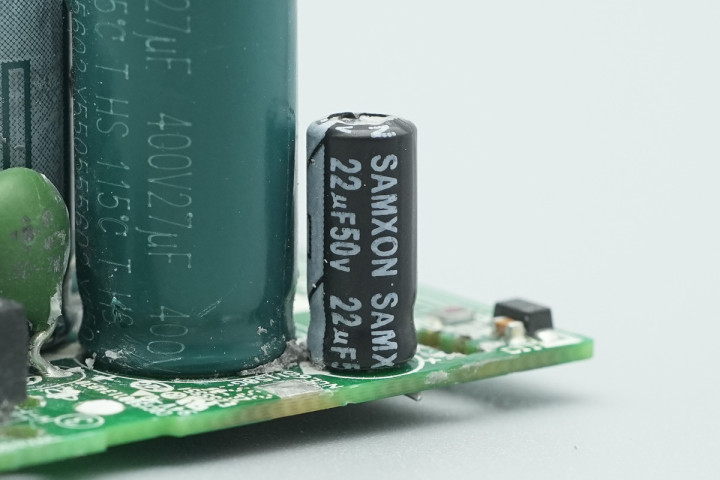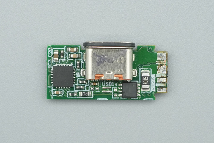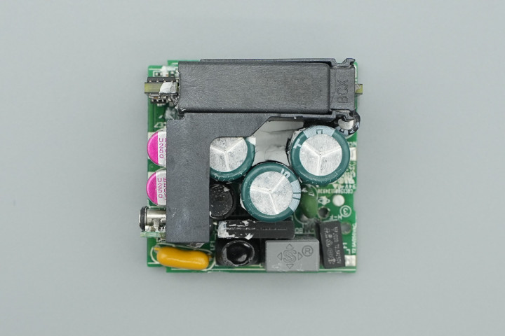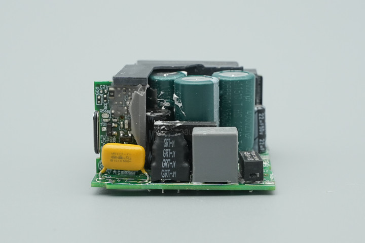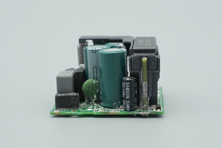 输出端设有两颗固态滤波电容,USB-C接口母座承袭小板焊合。