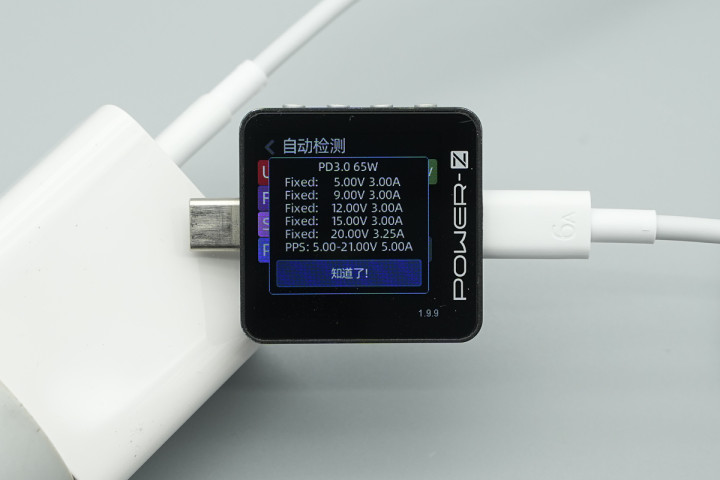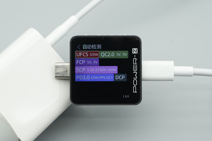 测得充电器USB-C接口撑握UFCS、QC2.0/5、FCP、SCP、PD3.0、PPS、DCP充电契约。