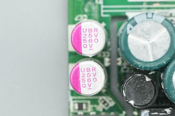 两颗滤波固态电容承袭万裕UBR系列,规格齐是25V560μF。