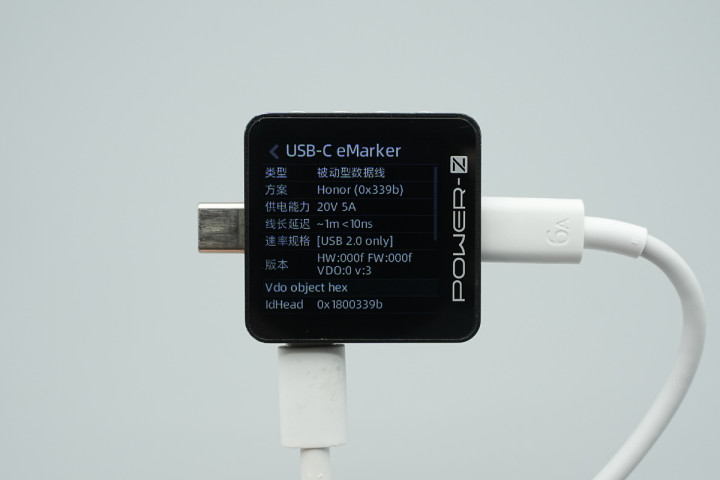 使用ChargerLAB POWER-Z KM003C测得线缆内置E-Marker芯片来自英集芯,电力传输能力为20V5A,数据传输能力为USB 2.0。