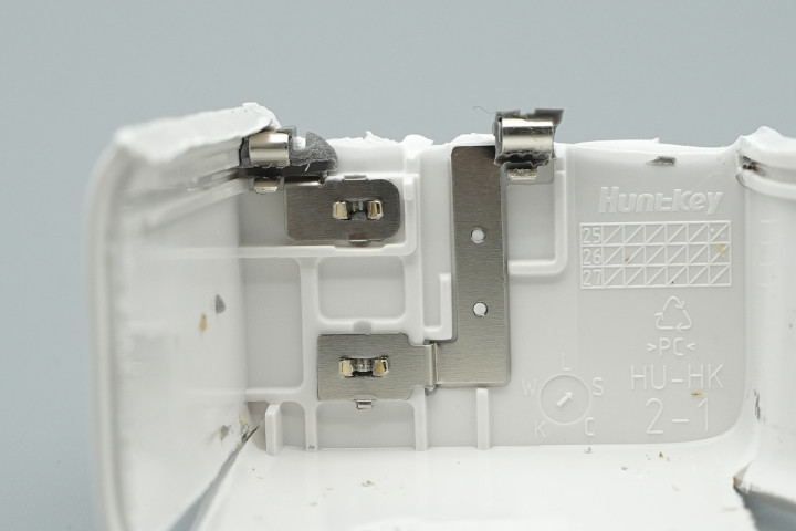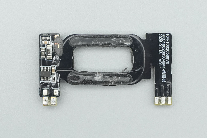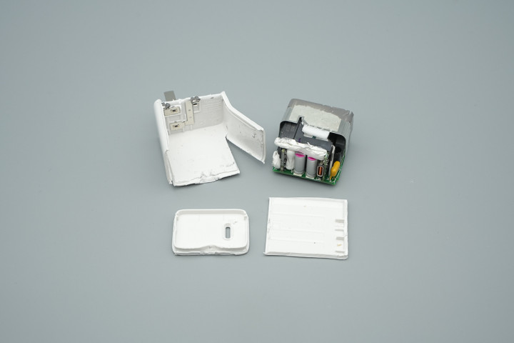 由于充电器输入端灌胶处理,在撬开机身顶部外壳后,扔需要进一步切割主体部分才能将PCBA模块取出。