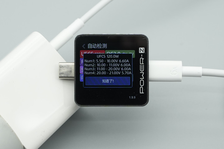 测得UFCS和会快充具备5.5-10V6.6A、10-11V6A、11-20V6A、20V-21V5.7A四组电压档位。