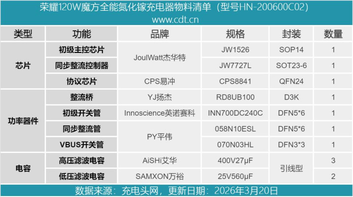 临了附上荣耀120W魔方万能氮化镓充电器的中枢器件清单,浅易各人查阅。