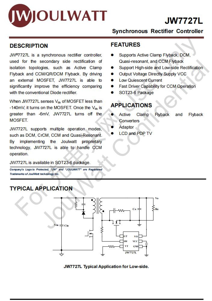 同步整流戒指器来自杰华特,丝印JWP2J,内容型号为JW7727L,专用于ACF以及CCM/QR/DCM阻遏式拓扑结构的次级侧整流。器件通过入手外部MOSFET,较传统二极管整流决策能显贵种植系统效果。