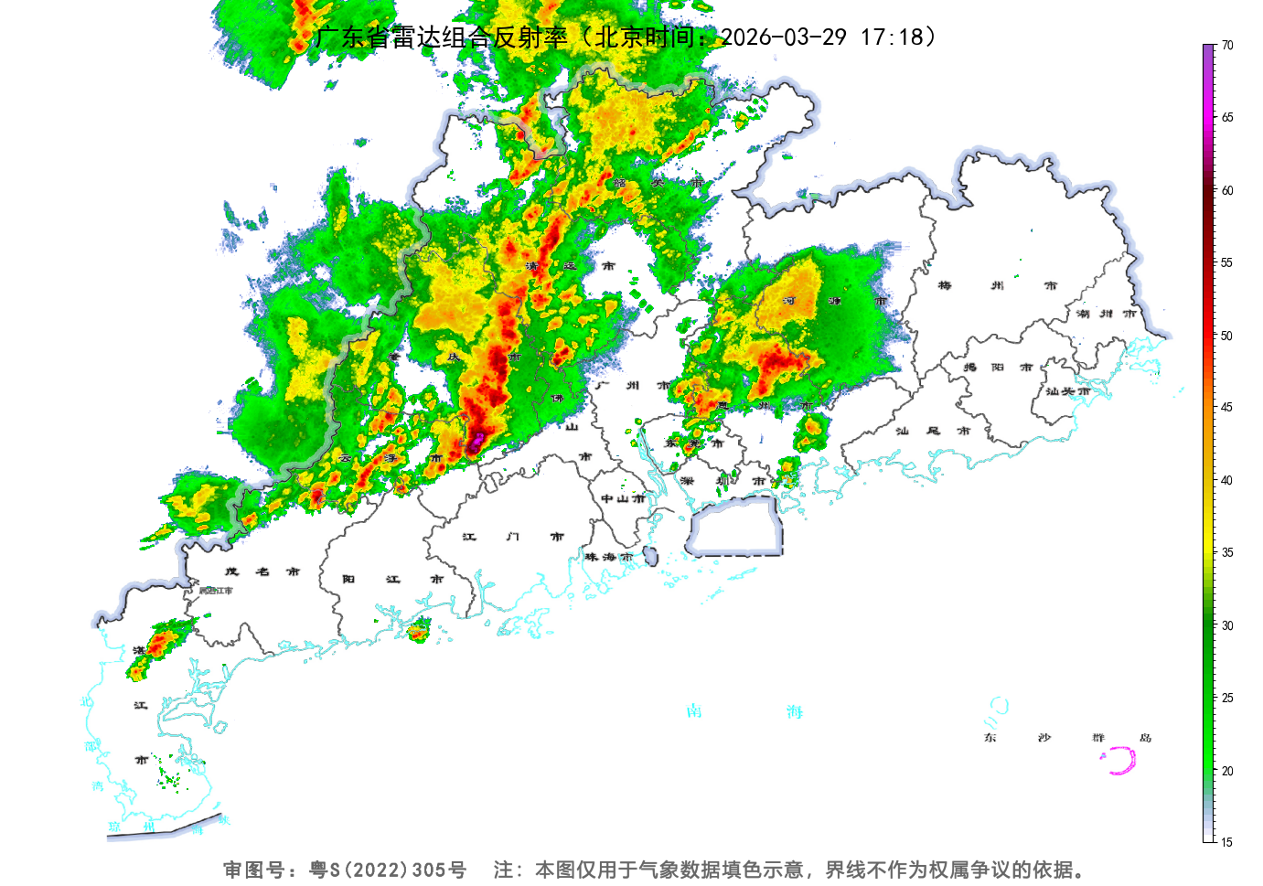 广东气候雷达图露出,终了29日17时18分一股强雷雨云团正自西向东移近广州。广州天气网供图