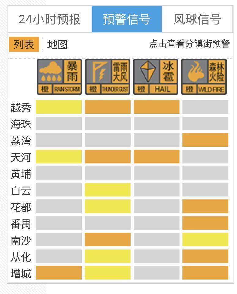 终了3月29日17时50分,越秀、河汉络续发布暴雨黄色、雷雨大风和冰雹橙色预警信号,增城发布暴雨橙色、雷雨大风黄色预警信号,南沙发布雷雨大风橙色预警信号,白云、花王人、从化发布雷雨大风黄色预警信号。
