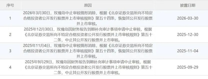 初度中止审核情形废除仅一个月,2025年12月4日,玫瑰岛第二次收到北交所审核问询函;12月30日,玫瑰岛再次因财务通告到期补充审计事项,被北交所中止上市审核。