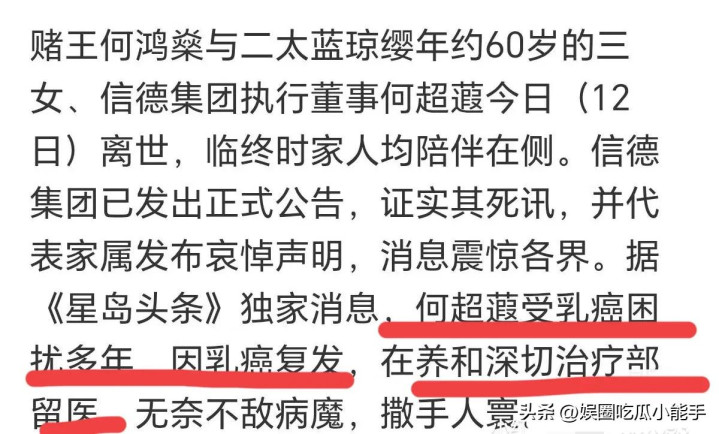 在这里也祝贺何超蕸可以一齐走好,愿天国莫得疾病,她在那边可以幸福本旨的生存。