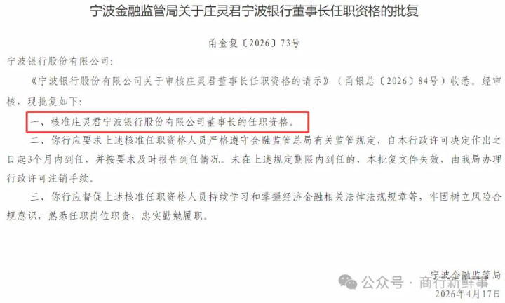 2026年4月17日,国度金融监督处治总局宁波金融监管局发布了《对于庄灵君宁波银行董事长任职经验的批复》。公告浮现,核准庄灵君宁波银行股份有限公司董事长的任职经验。