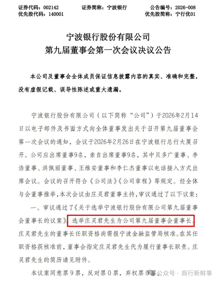 本年2月,宁波银行董事会已选举庄灵君为新任董事长,彼时董事会还选举原副行长冯培炯被聘请为新任行长,以及多名副行长、董事会秘书、财务认真东说念主、审计部总司理等职务东说念主选。