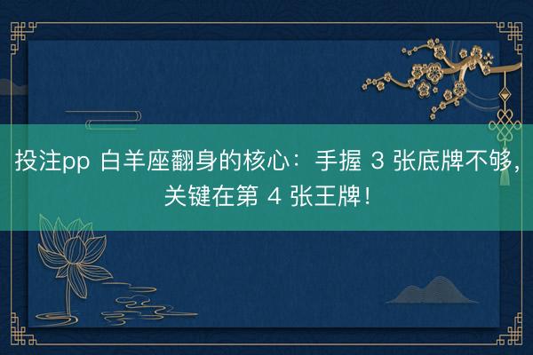 黄道十二宫第一宫的白羊座,生来就带着火星赋予的行动力与抗争性,本位火象的特质让他们人生起伏远超其他星座。 受阻时行动力反而更强,年轻时被诟病冲动急躁,成年后却靠着这份打破常规的开创力,成为时代转型期的稀缺资源。 天生性格提供动力,多年历练积淀实力,星象时机搭好舞台,这三张底牌已经足够强大。 但为什么有的白羊座手握好牌,却始终无法一飞冲天? 答案藏在最关键的第四张底牌里…… 白羊座作为黄道十二宫的第...